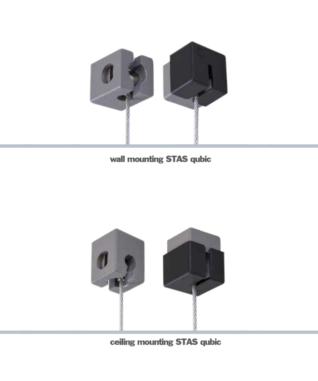 The STAS qubic is a compact and square hanging system. Do not under estimate STAS qubic by its size. The STAS qubic is suitable for one hanging point and can be easily installed in the more difficult places. Think of a stairwell, a slanted ceiling or a pillar. The STAS qubic can be mojnted in many different ways and therefore the cords can also be hooked in many possible ways. The versatility of the STAS qubic makes it indispensable hanging system for difficult places.